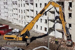 A high-reach demolition excavator is specialized machine equipment designed to safely and precisely tear down the tall buildings and other structures that a traditional excavator cannot safely reach.